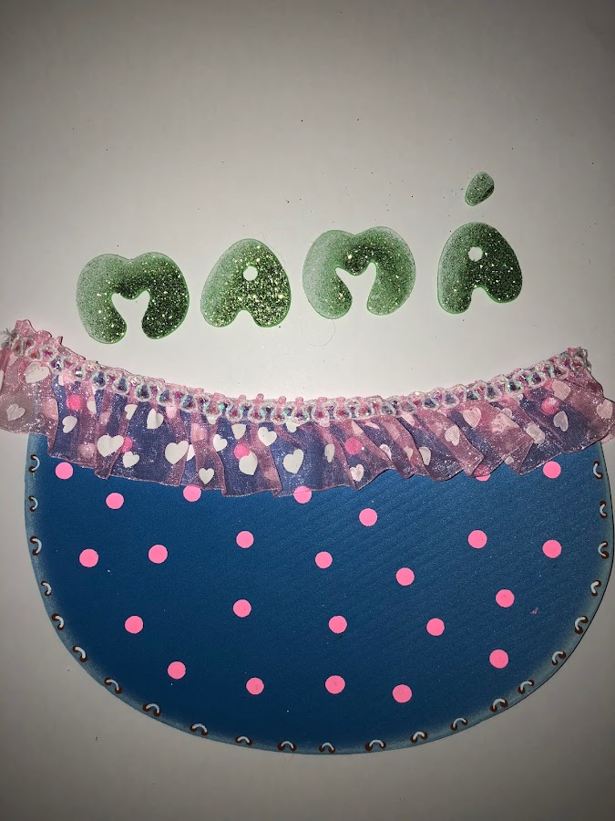 4. Formamos la palabra MAMA con microporoso escarchado verde limón, así mismo elaboramos la pieza correspondiente al saquito en microporoso azul y le pintamos puntitos rosa, así mismo decoramos con encaje rosa.