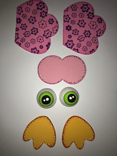 2. Recortamos las alitas de la buhita en microporoso estampado e igualmente en cartulina duplex 450 grs, recortamos la pieza correspondiente a los ojos en microporoso rosa y la sombreamos con fucsia así mismo le hacemos con el pincel una imitación de costura, lo mismo hacemos con las patitas. Para formar los ojos cortamos una bolita de tecnopor Nro.2 a la mitad y sobre ella termoformamos dos piezas verdes y dos piezas negras para formar el ojo (ver foto).