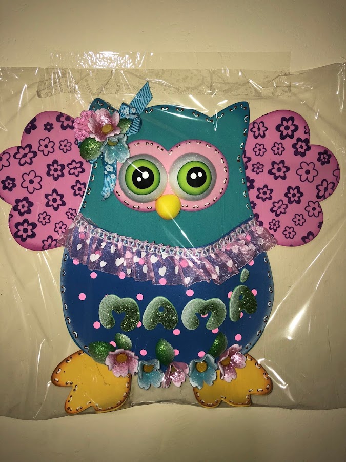 6. Para Terminar ensamblamos nuestro proyecto como se puede observar en la imagen de abajo. Para decorar la buhita hicimos un bouquet de flores, hojitas y un lacito de razo y decoramos una de las orejitas de nuestra buhita.