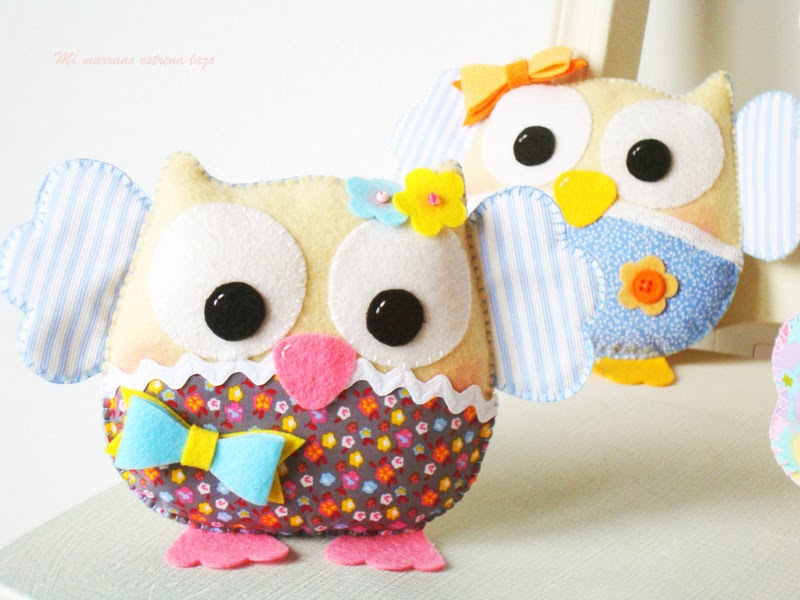 El cuerpo está realizado de fieltro, y la barriga es de tela de distintos estampados. Las alas llevan fieltro por dentro para darles cuerpo y tela estampada por el exterior. Los ojos y pico tambien están realizados en fieltro. El relleno es de fibra sintética de peluche, y por último están decorados con lazos o flores: Están guapisimos!!!!!! quien no querría tener uno en su casa! Ideales para acompañar a regalos de bebés y niños pequeños, aunque si quereis saber la verdad, yo me quedé con dos, porque me chiflan!!!!! que bonitos quedan en la habitación, jejejeje
