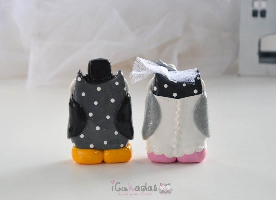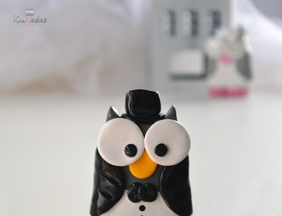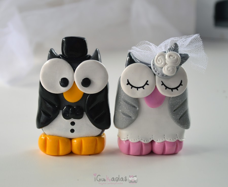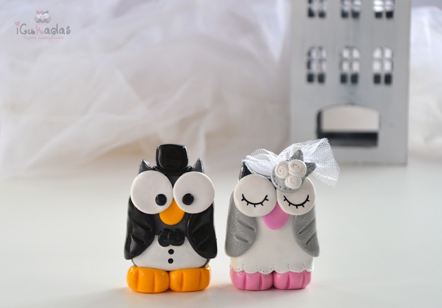 Son los muñecos de la tarta de boda, pero en vez de ser los clásicos del novio y la novia, pues son unos búhos-novios o novios-búhos, o algo así.