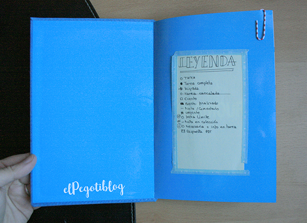 Como ves, mi cuaderno no es nada del otro mundo. Es un cuaderno que regalaban con una revista, y que tenía sin utilizar. Las hojas son de líneas gruesas, que no es lo que más me guste para el Bullet journal, pero para comenzar a organizarme el trabajo así, es suficiente. La leyenda, como ves, la he creado en un post it y lo he pegado en la primera página.