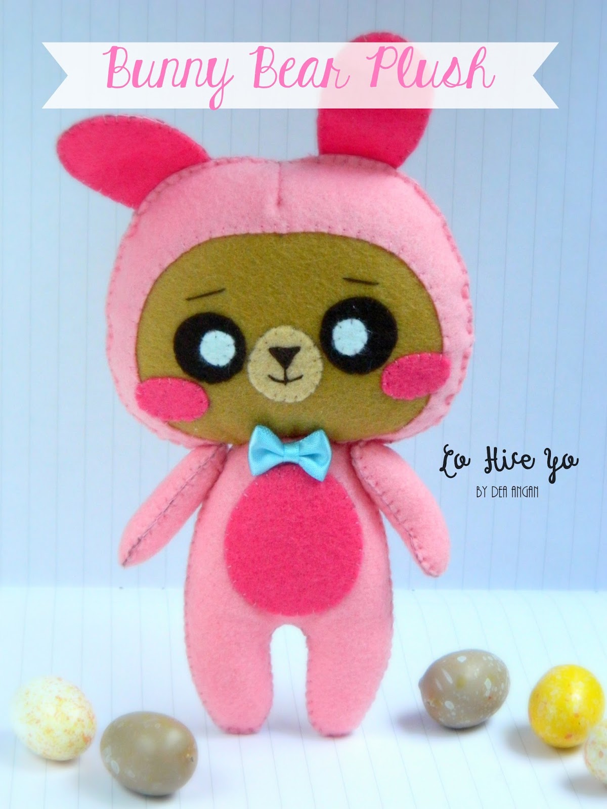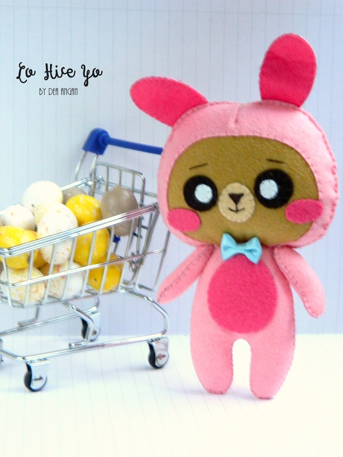 I am back again with another felt bunny and/or bear plush. Yes, I write it correctly: bunny and/or bear. Why? Because my newest felt plush here is actually a bear which is wearing a bunny suit. Thus, he looks like a bunny! This bear is ready to rock your Easter party. He even goes shopping for Easter eggs.