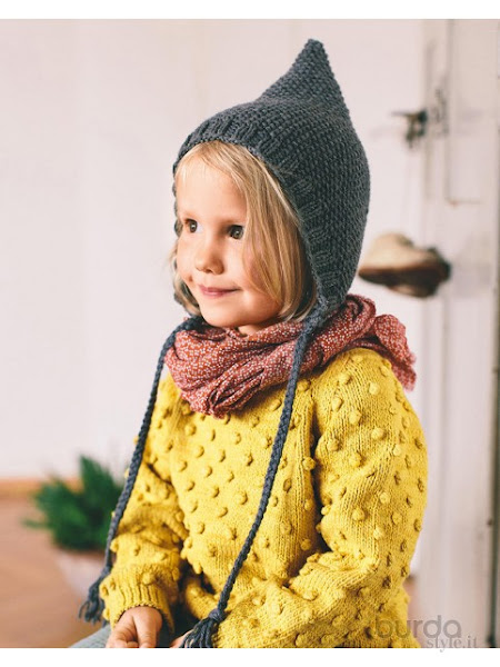 Y me encantaron estos dos modelos tejidos , una boina francesa en tamaño mujer y el gorrito tipo gnomo para niño , aunque lo que mas me gusta es el jersey de barriletes que lleva la niña , no vienen las instrucciones para tejerlo pero os puede servir de inspiración ,tanto en estilo como este color amarillo mostaza que tanto se lleva