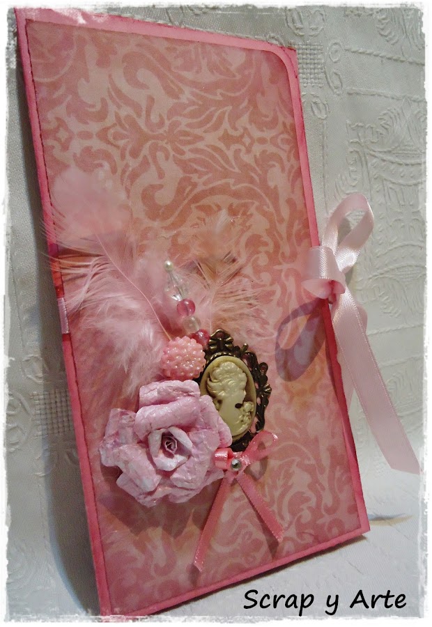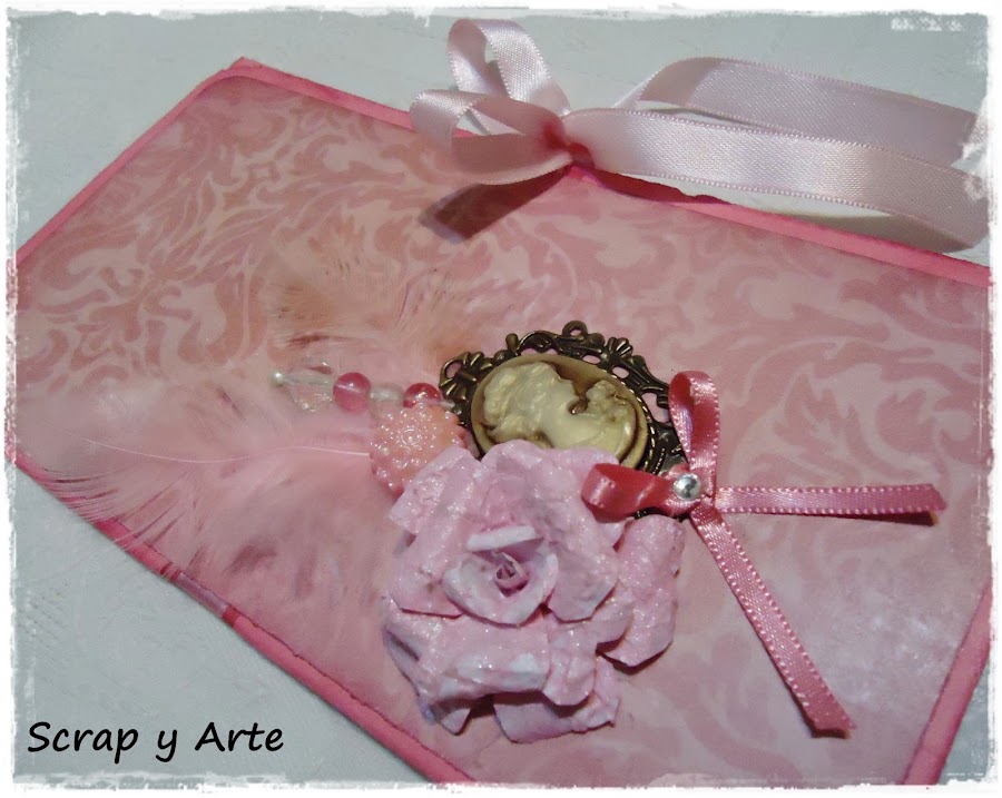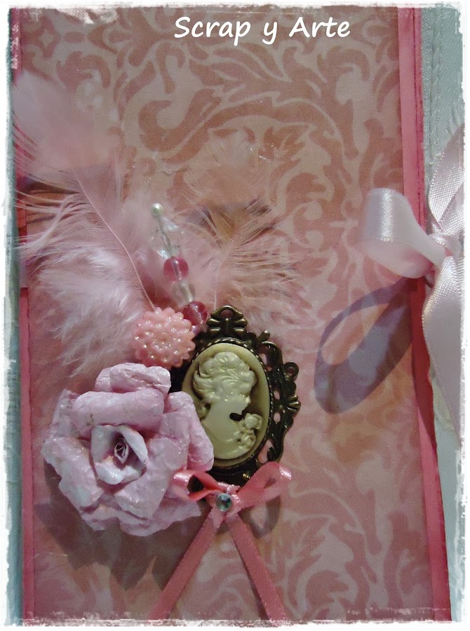 Decore la portada con un camafeo, plumas rosa, alfiler con cuentas transparentes y rosa, una flor realizada en papel rustico, un botón en forma de roseta y un moño con cinta bebé.