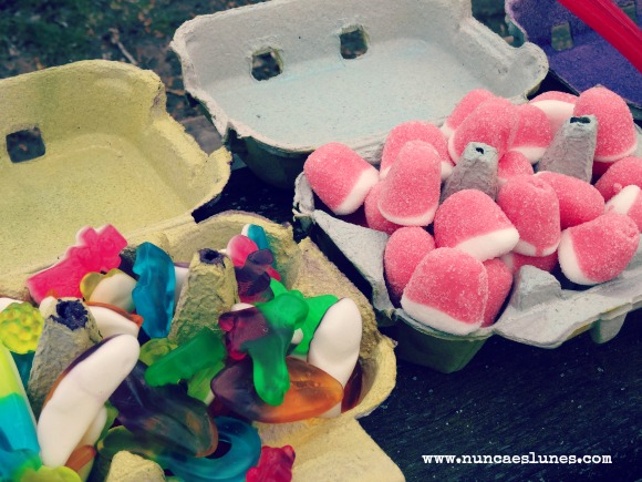 Conseguimos encontrar, a pesar de andar ya tarde (por lo visto) unos huevos de chocolate rellenos de chocolatinas, que escondimos entre los árboles, tapados con ramas, hierbas y cosas así, y también metidos en algunos huecos de árboles para complicar un poco la cosa para los más mayores. Además tiramos chocolatinas más pequeñas, muchas, en una zona bien delimitada para los más pequeños. Así, sin más, a simple vista.