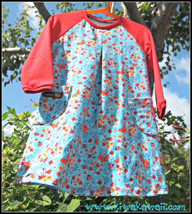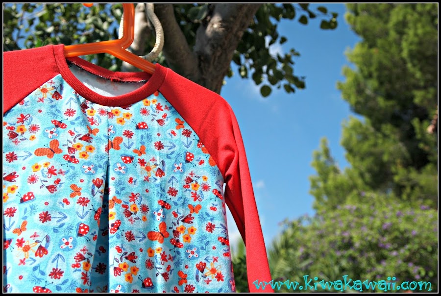 El vestido me parece una monada, su principal característica es la tabla que sale del cuello. El corte ranglán me encanta siempre, y da mucho juego para combinar colores. En esta ocasión, estampado de primavera para el cuerpo; mangas y cuello en rojo.