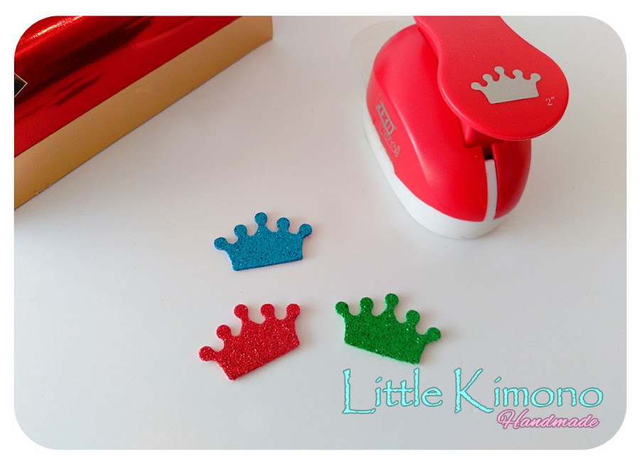 5. Con la perforadora de corona haremos las tres coronas de Los Reyes y decoraremos con adhesivos brillantes.