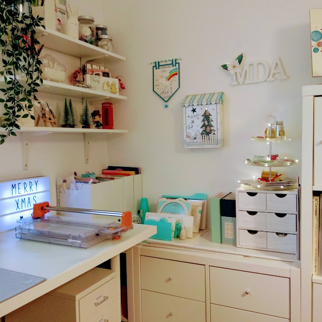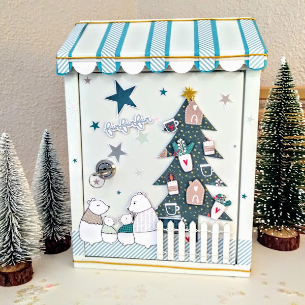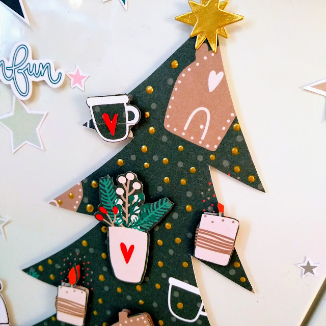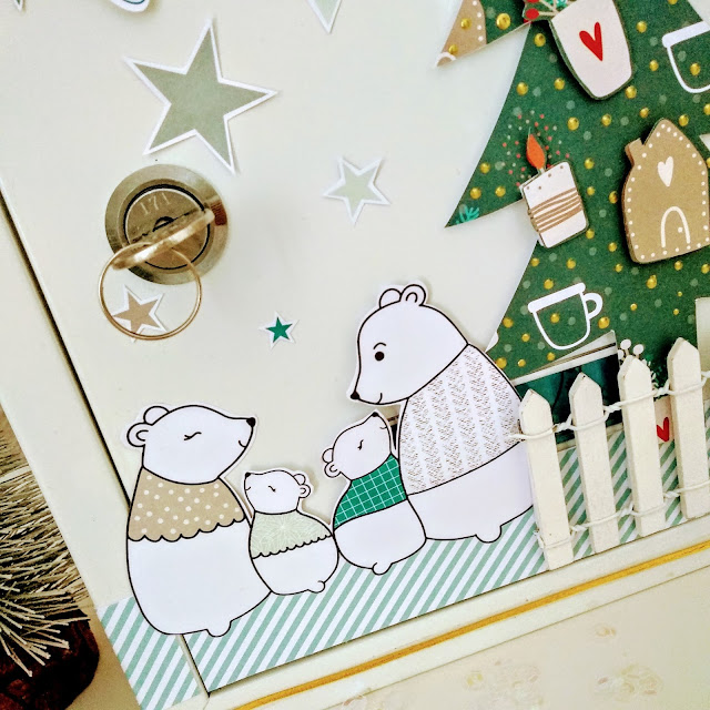 Con uno de los papeles, con fondo verde, he hecho un árbol al que le he añadido los mismos motivos del papel recortados y pegados con cinta 3D para darle volumen, de otro diseño he recortado estrellas y la familia de osos protagonistas del proyecto, el resto es mejor que lo veas, a mi me encanta como ha quedado.