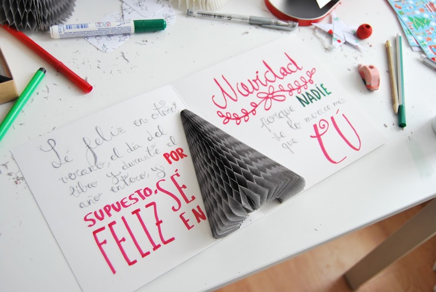 Y volviendo a nuestra tarde rodeada de rotuladores, tarjetas de Hema (somos muy adictas, esa tienda es una perdición, y no, no me pagan por la publicidad...) y árboles de nido de abeja de Ikea, (que después pueden sacar de la tarjeta y utilizar como adorno); empezaron a salir cosas bastante riquiñas :-)