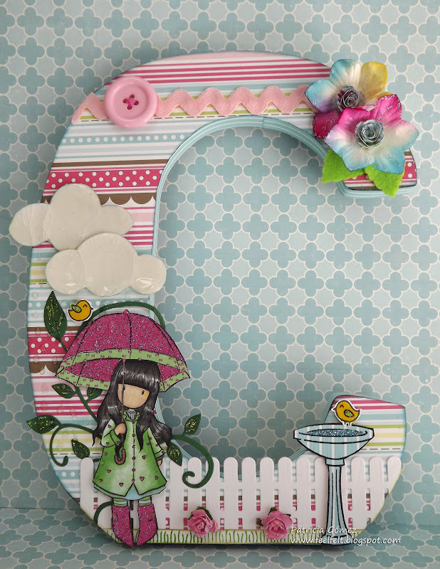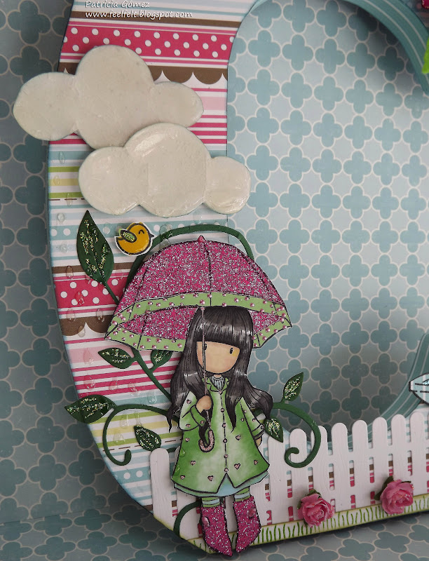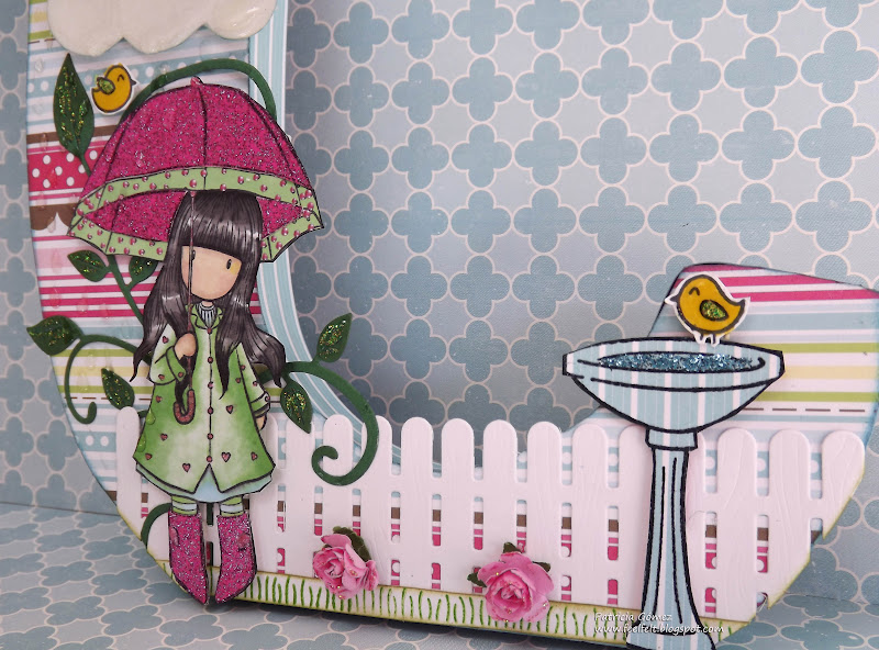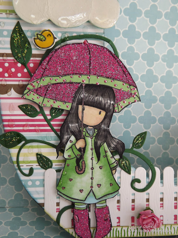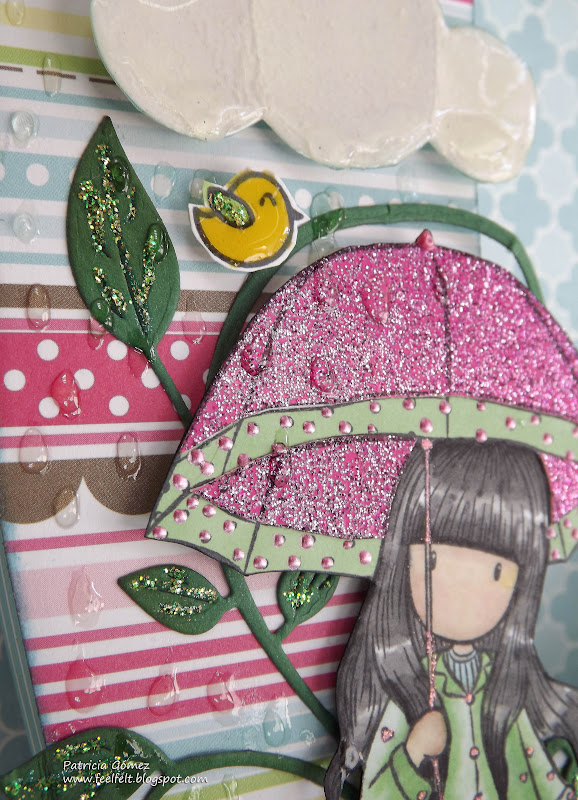Aquí podemos ver de cerca a Gorjuss Puddles of Love, coloreada con promarkers, exceptuando el paraguas y las botas, hechas con paper piecing, con un papel de purpurina de Teresa Collins de la colección Posh.
