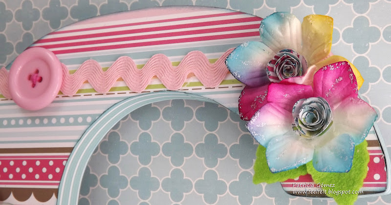 En la parte superior, cinta ondulina, un gran botón y unas flores, que llevan toques de stickles y en el centro de ellas llevan el troquel Die-namics Rolled Mini Roses.