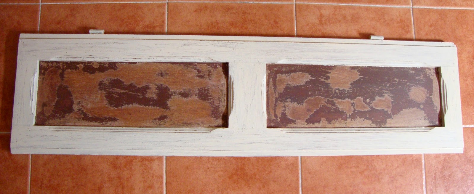 Las contraventanas las había rescatado mi hermana, otra artesana que también hace de todo un poco. Una ya la había utilizado para un cuadro precioso (en otra visita haré fotos) y la otra la tenía lijada desde hace tiempo pero seguía en la lista de espera en el garaje. Esta fue la que me tocó en el lote, lijada y todo, qué más se puede pedir!!
