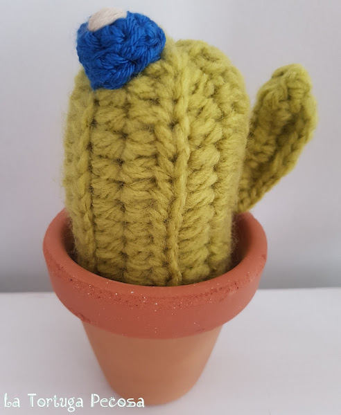 Hoy llega un bonito cactus color verde lima con una florecilla azul. Lo bueno y genial de estos cactus de crochet es que no hay que regarlos, bueno sí, se riegan con sonrisas. Son ideales para un escritorio o para la oficina y te despreocupas de regarlos con agua.