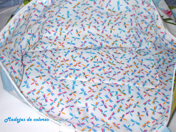 En su interior, una tela de libélulas en los mismos colores que el exterior y un gran bolsillo para el móvil.