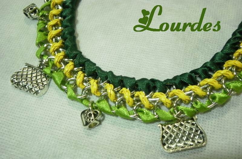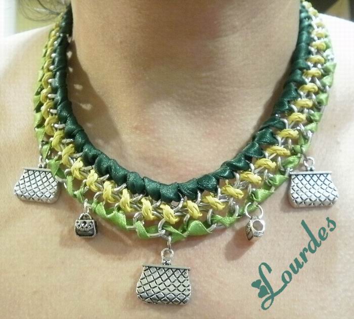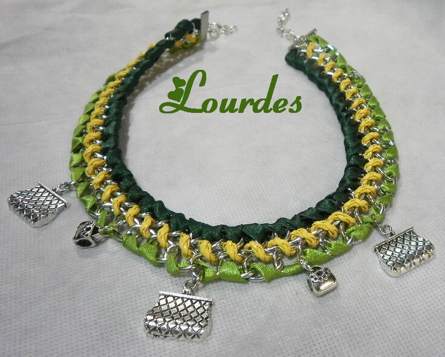 Collar con cadena plateada y cintas en dos tonos de verde y tira en cuero amarillo trenzada.Colgantes en forma de bolso plateados
