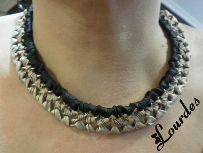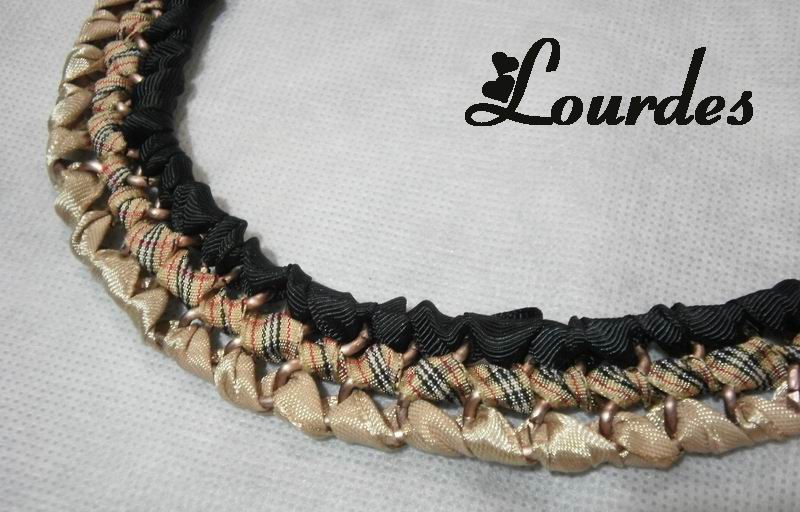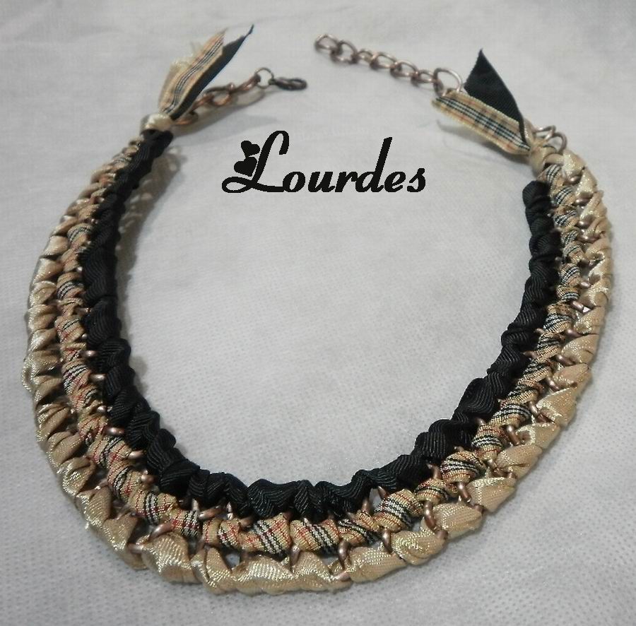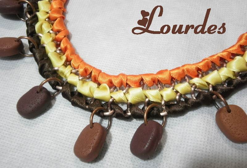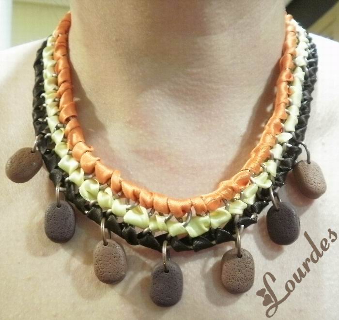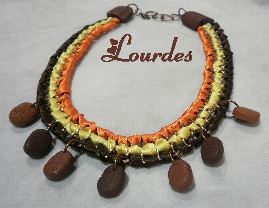 Collar con cadena en bronce con cintas en marrón , amarillo y naranja con piezas en arcilla polimérica en tres marrones