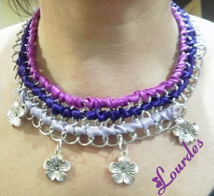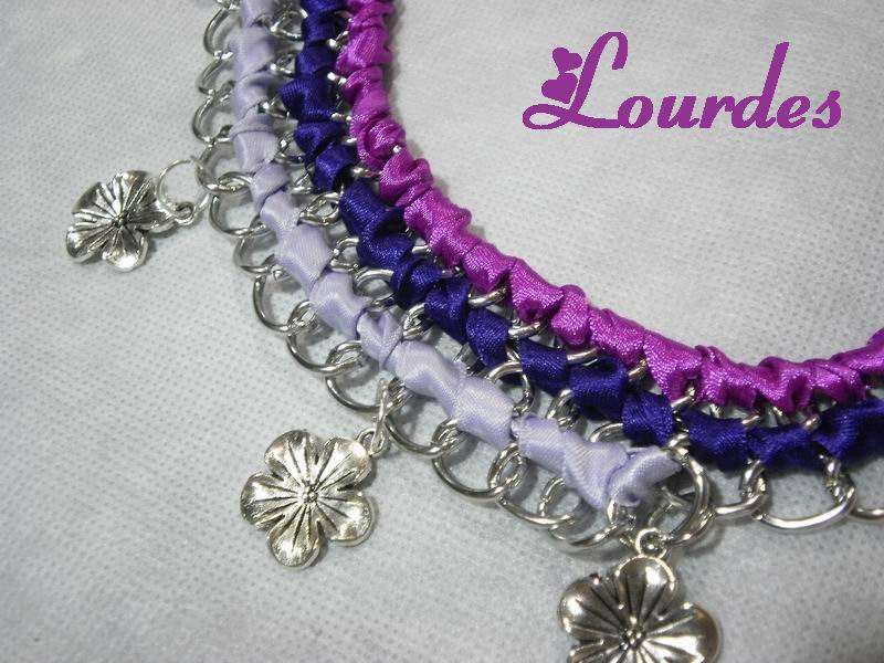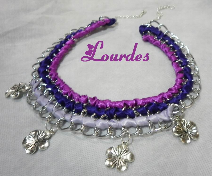 Collar en cadena plateada en colores cardenal, morado y lila. Colgantes en forma de flor plateados