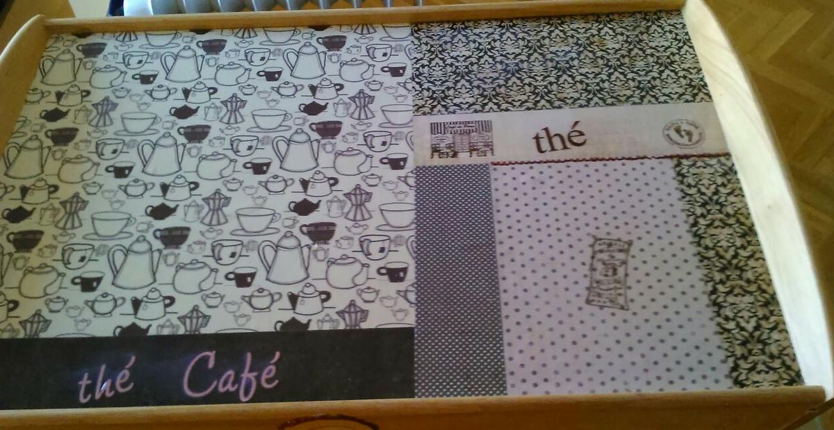 Las cajas y bandejas están decoradas con fotocopias de fondos e imágenes de internet, algunas son de descarga libre, en otras hay que pagar una pequeña cantidad, y algún otro papel utilizado son cartulinas de scrap. Las fotocopias de internet tiene el problema de no poder barnizarse, pes la tinta se corre. Pero se le puede aplicar un barniz en spray. Estoy ensayando con polimérico liquido y luego barniz, ya os contaré como termina el experimento. Son recortes de papel unidos y mezclados con otros tipos de papeles. También descargue etiquetas de café, se recortan, se pegan en un soporte y voilá !! algo para decorar…