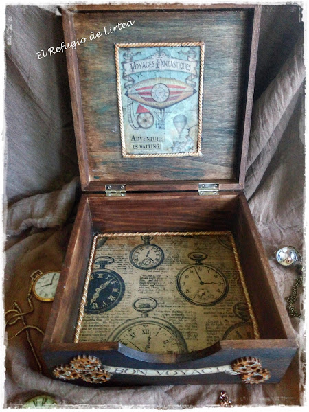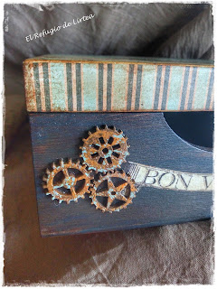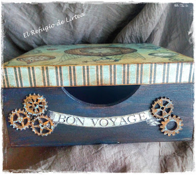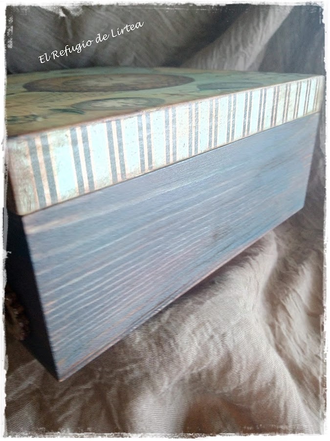 Sobre los bordes de la tapa empleo restos de papel decoupage que me sobraron de otro trabajo y que por los tonos le viene ideal.