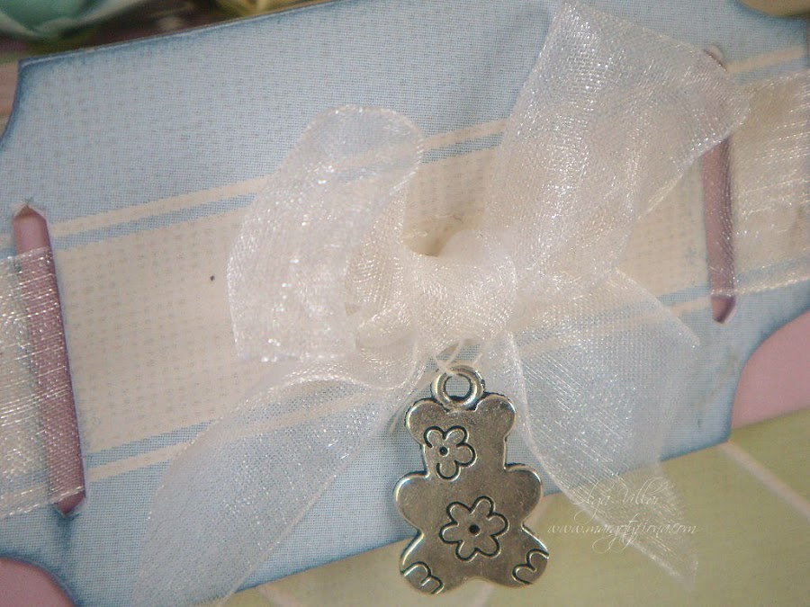 Detalle del lateral de la tapa, con un lacito de organza blanco y un charm de osito,