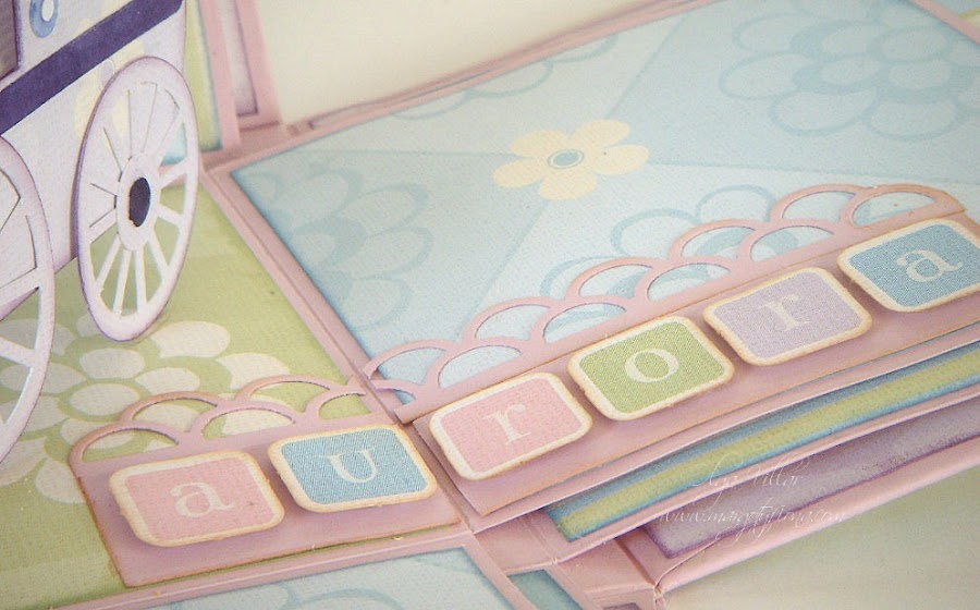 Personalizada con el nombre de la bebé, sobre unas tiras troqueladas con el troquel Die-namics, Double Scallop Border, en tonos lila, como toda las bases de la caja.