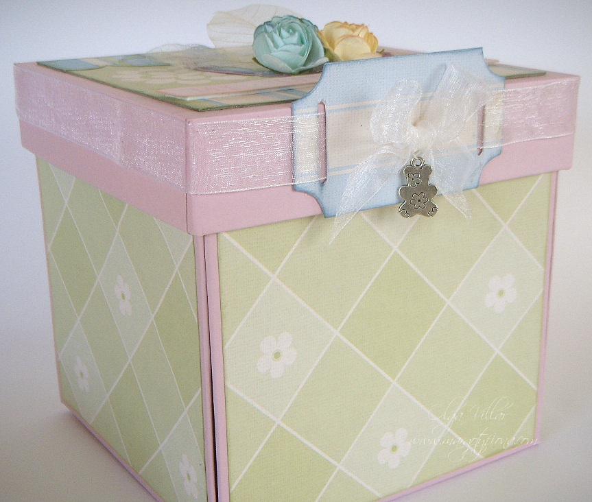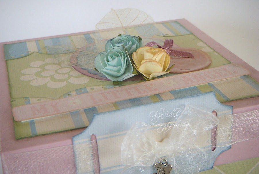 ¿ Y qué tiene de especial esta caja?? Pues que está hecha con técnicas de cartonnage. Luego he conseguido dar la rigidez necesaria para poder añadir las fotos que se quieran y los adornos que quiera también, aunque para este caso no ha sido necesario en cuanto al peso de los adornos, porque como veréis es bastante "simple and clean".