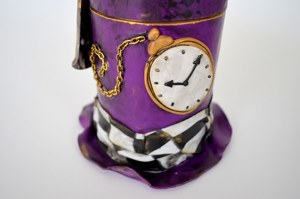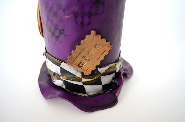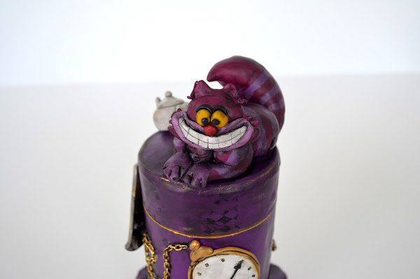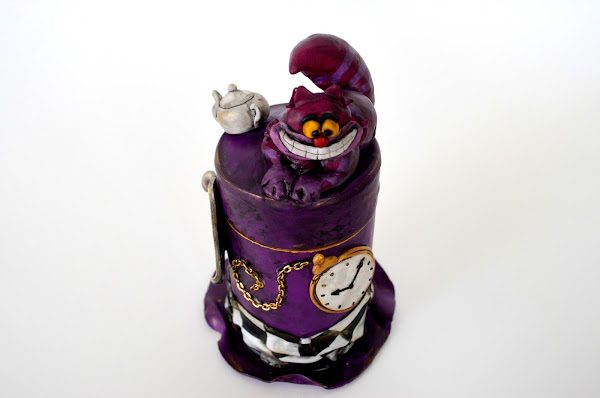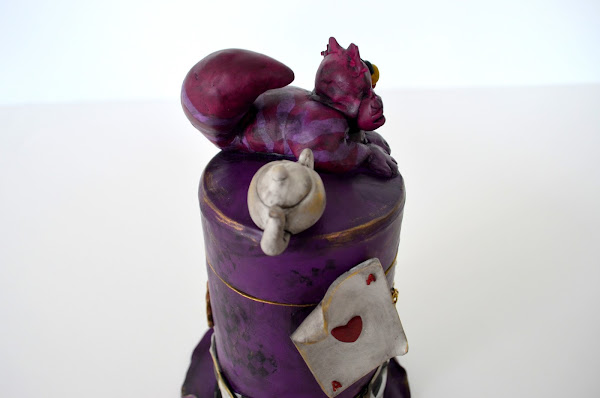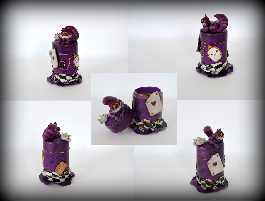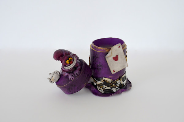 Se trata de una caja realizada enteramente en arcilla polimérica y decorada con elementos de Alicia en el País de las Maravillas: el gato de Cheshire, una carta de póker del as de corazones, una galleta que dice "eat me", un reloj de bolsillo, una tetera y la propia caja que representa un sombrero.