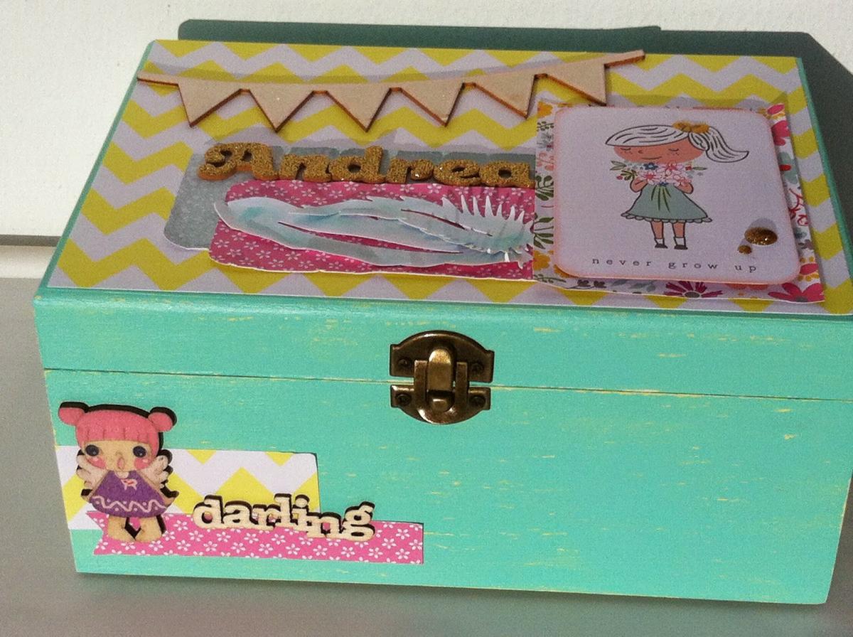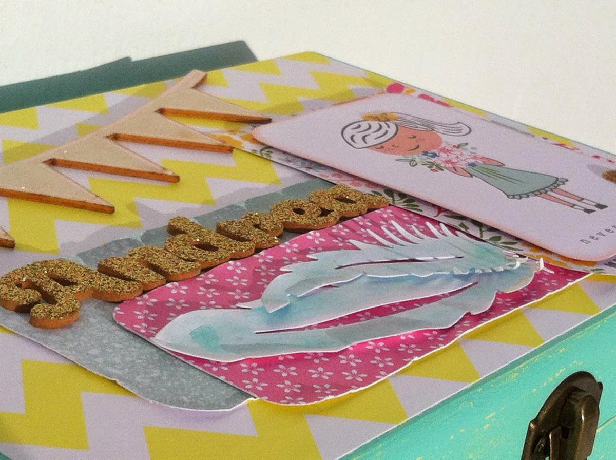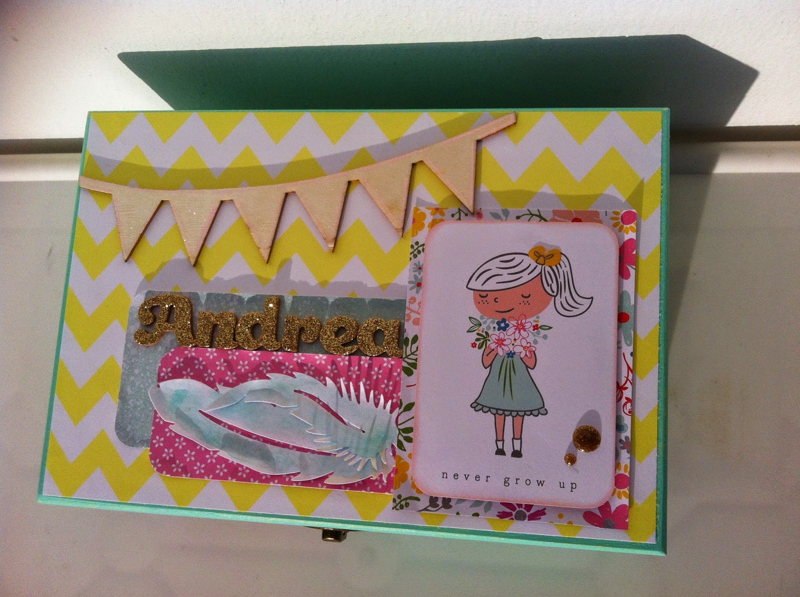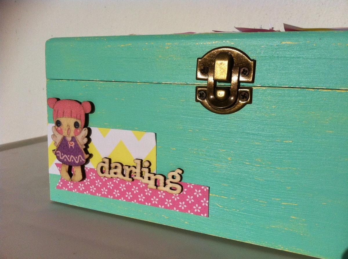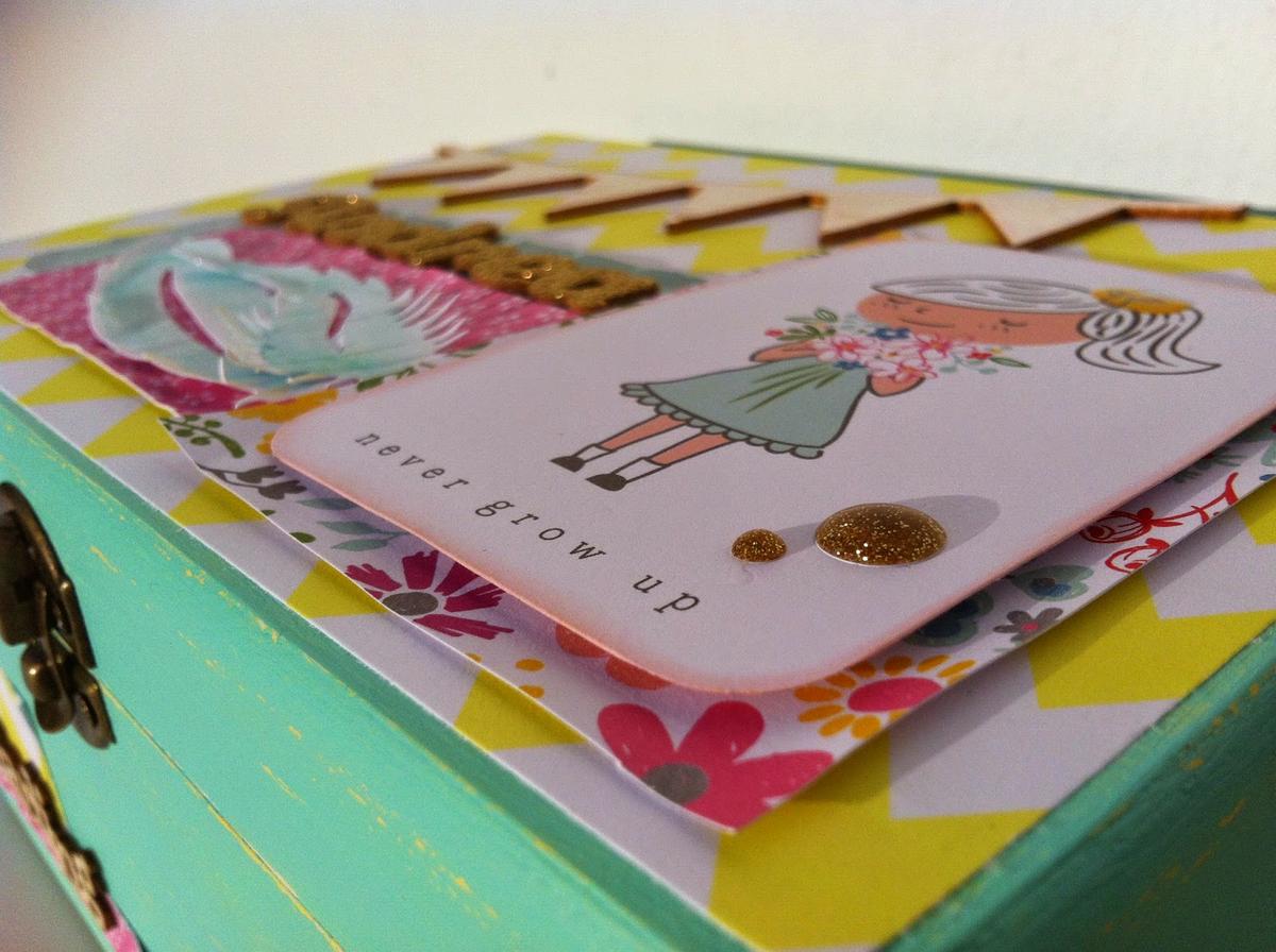 Y esta es la cajita terminada. Para pintarla he hecho un decapado con dos colores distintos, usando una vela para conseguir ese "ligero" efecto desgastado que le he dado. Y para decorar, papeles de scrap de distintas colecciones, thickers, glossy accents, enamel dots, troqueles de plumas y adornos de madera. La muñequita es una de las dos que me llegaron con el premio de "La Aventura de los Búhos", que me venía genial.