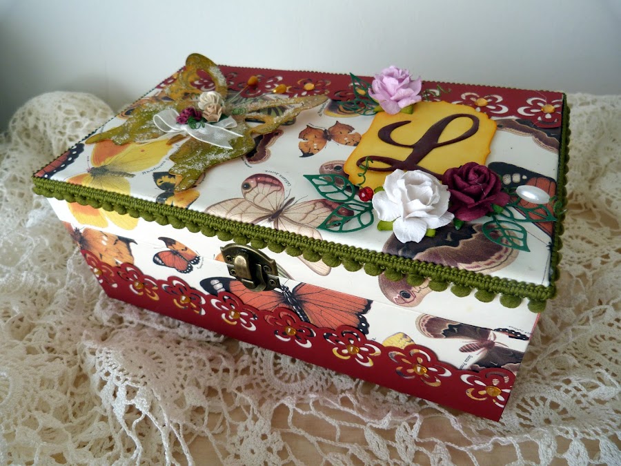 Alrededor de toda la caja solamente añadí un troquel de EK (Hawaiian Flower) con unos brillantitos y en la tapa una cinta de madroño en color verde oliva.