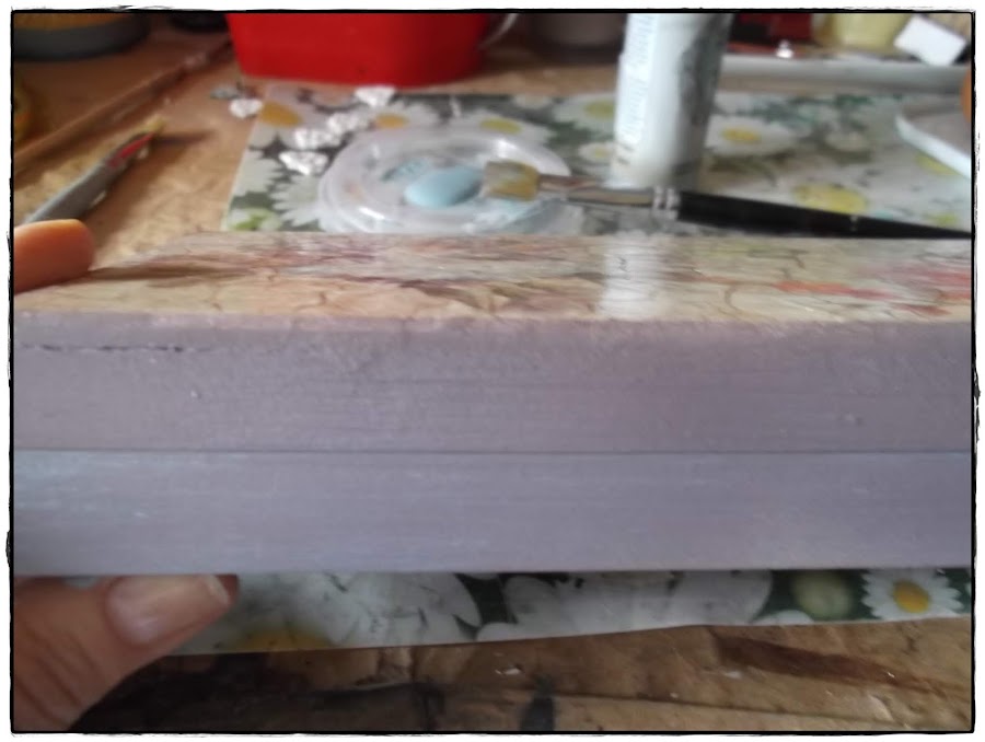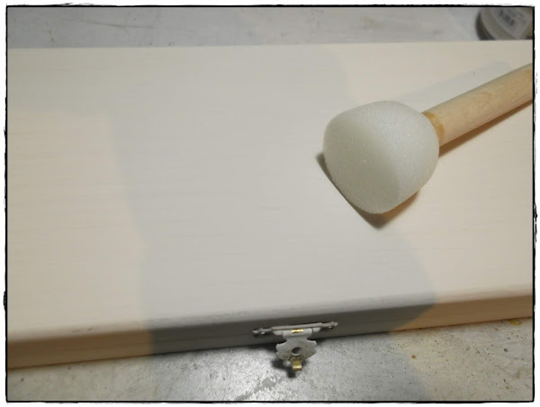 Luego vamos a prepararla aplicando una capa de Gesso. Con esto lo que hacemos es cerrar el poro de la madera para que al aplicar luego la pintura quede más homogénea. Además como voy a realizar decoupage siempre es mejor que la superficie sobre la que apliquemos el papel sea clara para que no pierdan intensidad de color las imágenes.