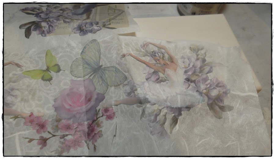 El papel de arroz es mucho más fácil de manejar que las servilletas, se hacen muchas menos arrugas, pero conviene tratarlo con el mismo "mimo", yo utilizo igual que con las servilletas una hoja de acetato y me ayudo con ella para ejercer presión.