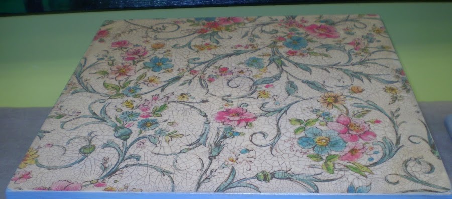 Aplico cola blanca disuelta con un poco de agua ( alkil, cola decoupage, mog poge, cualquiera sirve) sobre toda la tapa y pongo el papel , procurando que quede sin arrugas. Luego, le pongo un plástico encima y aprieto con un paño para pegarlo bien y que no me quede ninguna arruga.