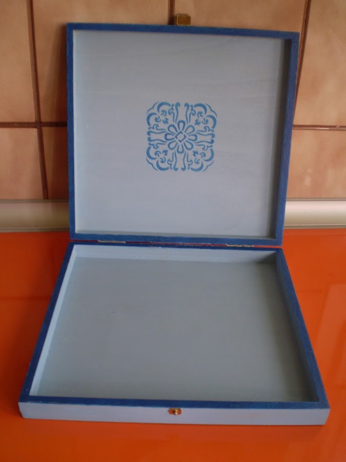 Lo primero que hice, fue lijar la caja, para dejarla suave y luego hice una mezcla de Gesso con pintura acrílica de color azul. Quedó un tono celeste y con esa mezcla comencé a pintar, dejando libre la parte donde iba a colocar el papel.