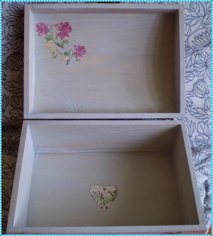 Por dentro están patinadas de la misma forma y sólo le puse dos pequeños adornos del mismo papel, unas flores y un corazón.
