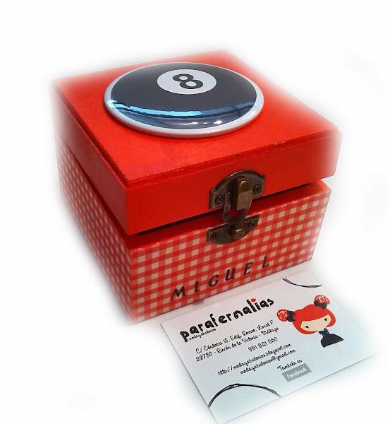 Esta caja es un encargo de unos papás para el cumple de su hijo Miguel. Como cumple 8 añitos querían que en la caja hubiera un número 8 como protagonista y a mi se me ocurrió la idea de hacerle una bola ocho para la tapa. El resto va pintado y forrado con la técnica del decoupage. Y para que fuera más personalizada, le sellé su nombre en el frontal.