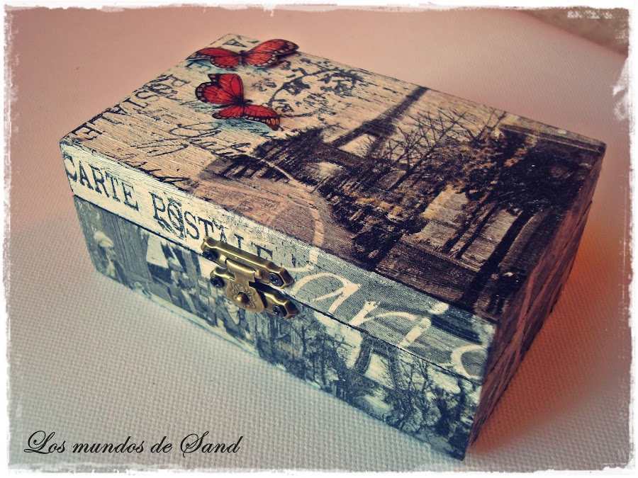 Las técnicas utilizadas son decapado, decoupage y estampación de sellos... Esta es la cajita que se hizo en un principio, luego decidimos obviar las mariposas. Espero que os guste, que le haya gustado mucho a la destinataria y sobretodo que la disfrute y !!Bon voyage!!