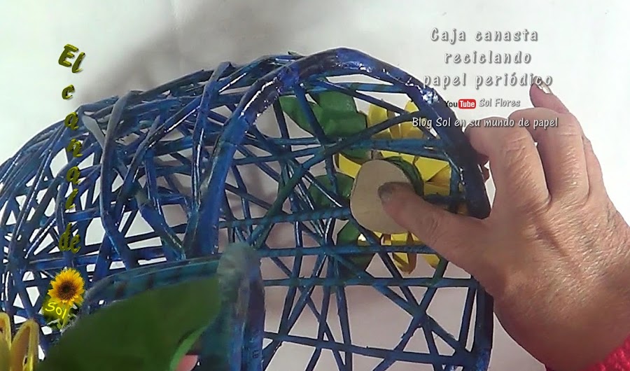 ya seco lo pinté con pintura en spray color azul y pegué la tapa con un cinta transparente que después pienso cambiar por un listón azul, le pegué con silicón caliente los girasoles que hicimos con los rollos de cartón, reforzados con un cartoncito por dentro, le di solo dos capas ligeras de pintura porque me gustó el efecto que quedó al notarse las letras y los colores de las varillas, todavía no sé qué voy a guardar, pero tiene que ser algo que no pese mucho, por lo pronto me encanta como adorno, a que si nos ha quedado bonita nuestra caja,