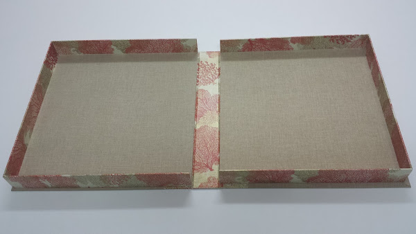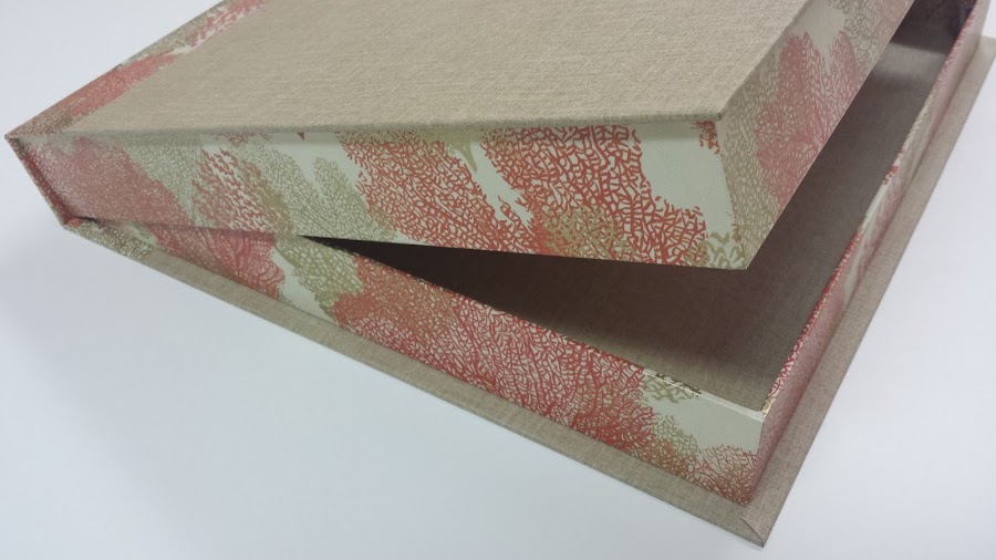 Caja de 35*30*6 forrada con papel decorado y papel entelado en beig.
