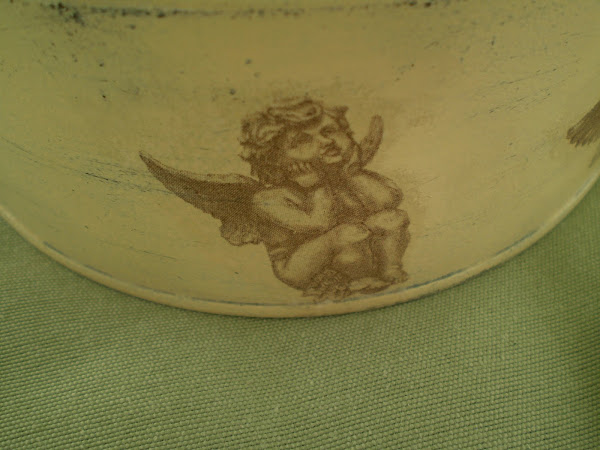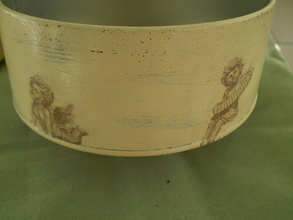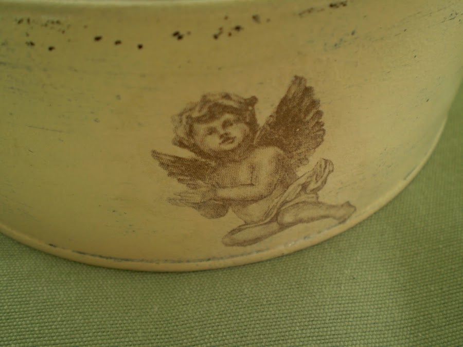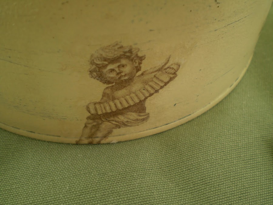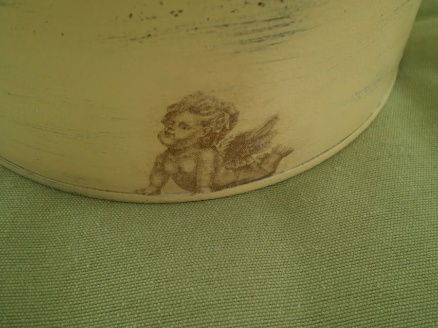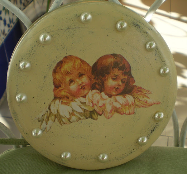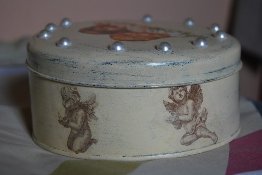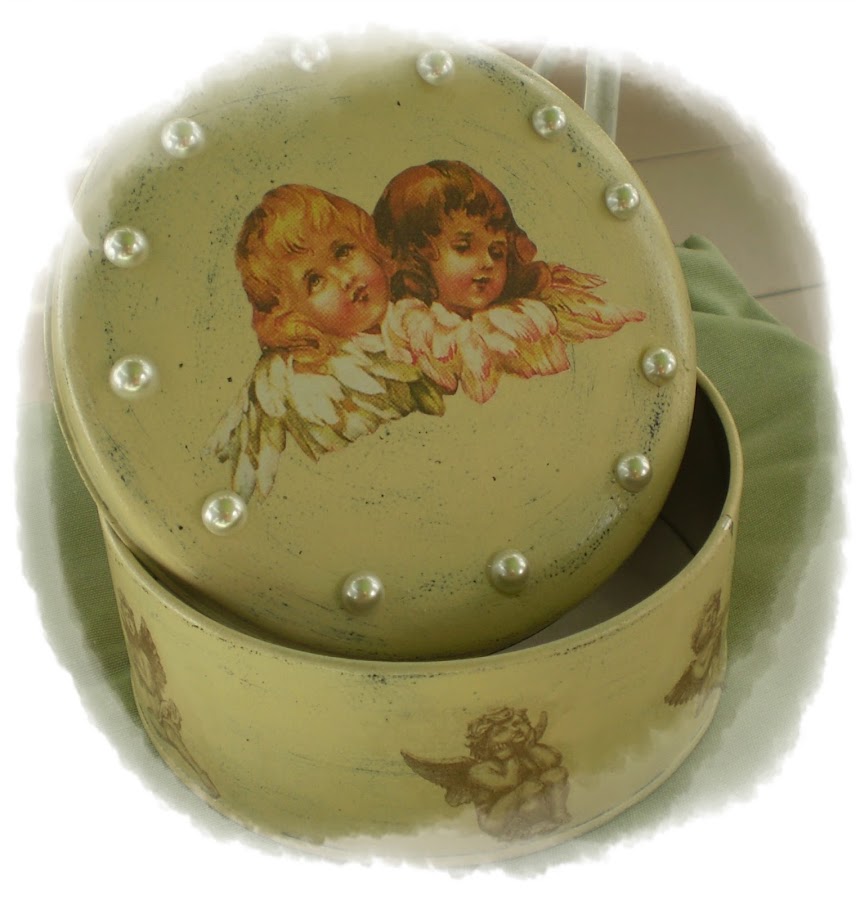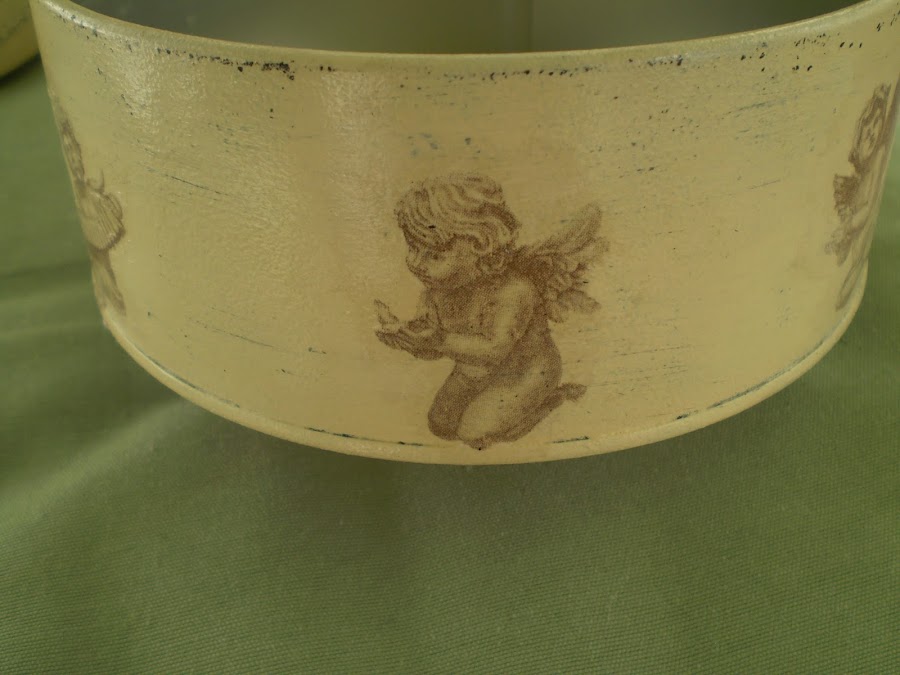 Lo he hecho, en la base, con imágenes de angelotes de una servilleta y en la tapa con una imagen de dos ángeles en papel decoupage.