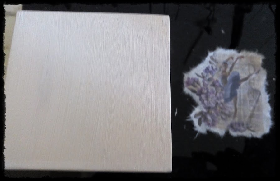 En las caras donde van las imágenes he pintado en color piedra.( un color claro, para que la imagen no pierna nitidez) He rasgado las imágenes de papel de arroz y las he pegado con medium decoupage. ( podéis utilizar cualquier medium, cola blanca o incluso barniz).