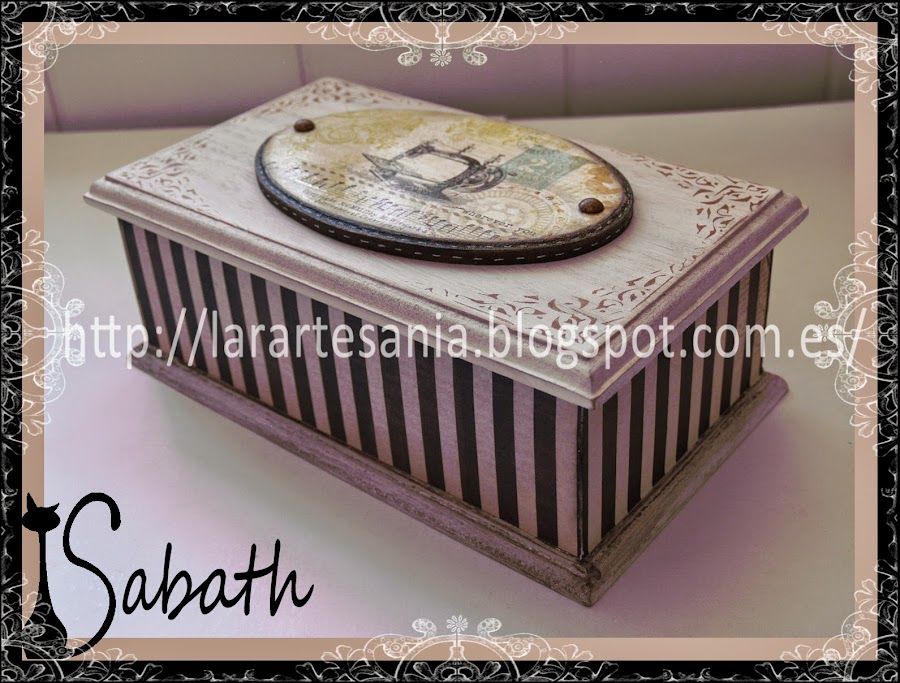 Se trata de una caja, la pinte en blanco roto, el decoupage de la parte inferior es papel de scrap al igual que el pequeño dibujo de la parte de arriba, el falso cosido que rodea la maquina de coser esta pintado con tipex de bolígrafo, va genial para pintar pequeños detalles