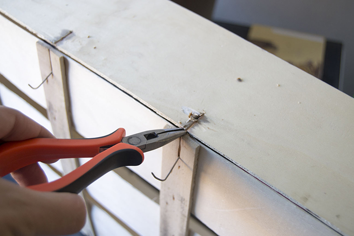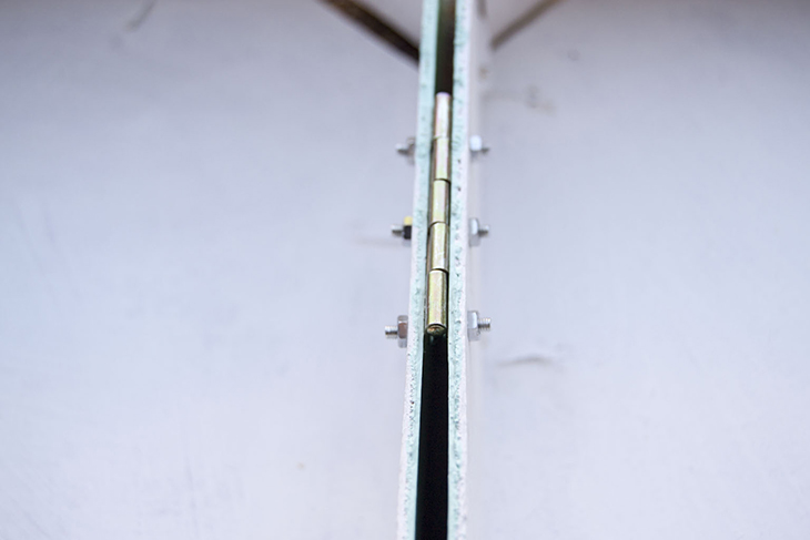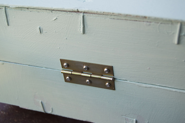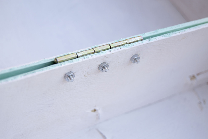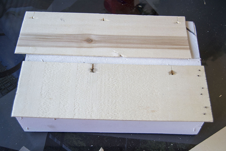 Colocamos una bisagra en el otro lado. Como la madera de la caja de fresa es muy fina, cualquier tornillo sería demasiado largo, por lo que he optado por poner tornillos sin punta y ajustados por el otro lado con pequeñas tuercas.