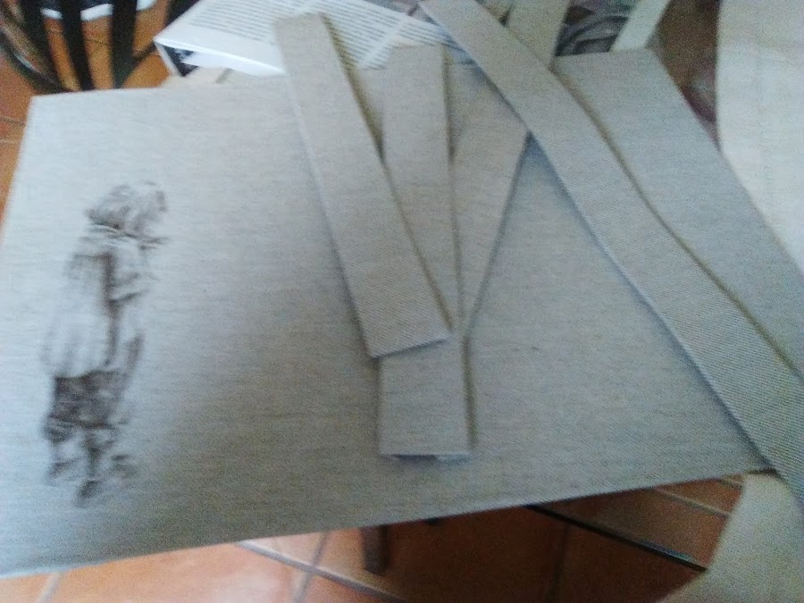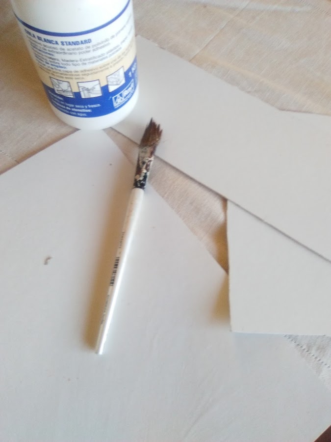 Para el interior cada uno lo hace de la manera qué mejor le parece,pero yo quería forrarla con lino y tenía miedo que la cola dejase manchas en el tejido,así qué he sacado patrones y he cortado cartones a la medida