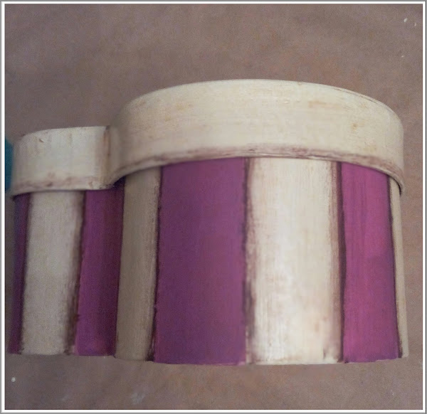 Con cinta de carrocero hice las divisiones y pinté con pintura chalk en color escarlata. Un truco para evitar que al retirar la cinta se lleve parte de la pintura base, la chalk color hueso, es barnizar antes toda la caja y luego hacer las divisiones con la cinta de carrocero.