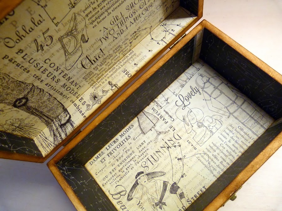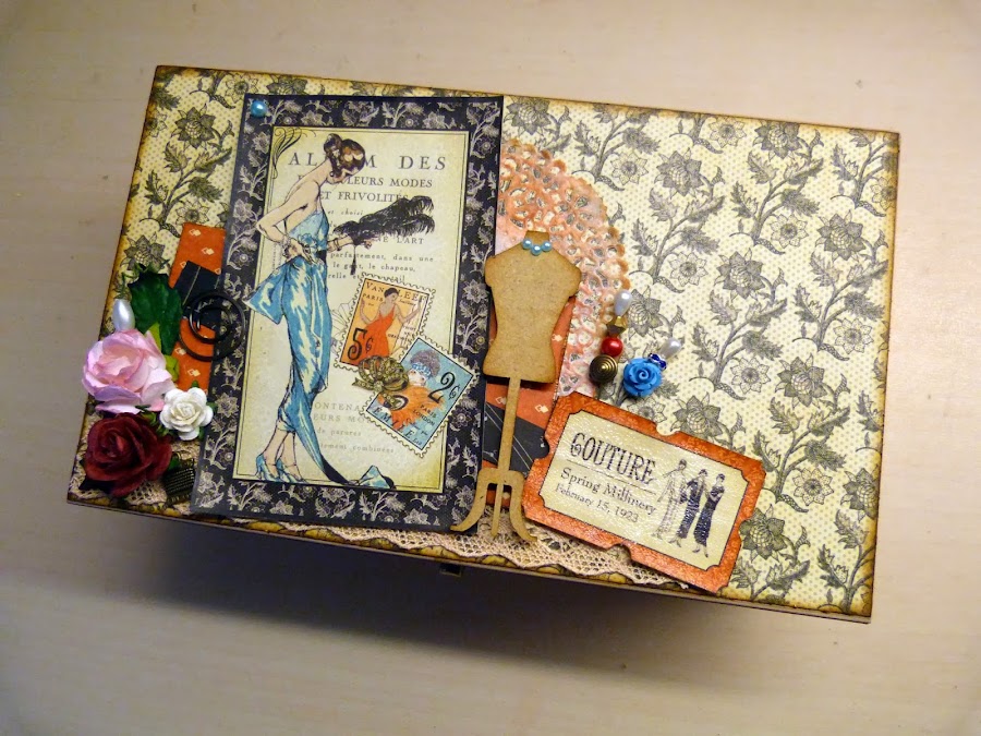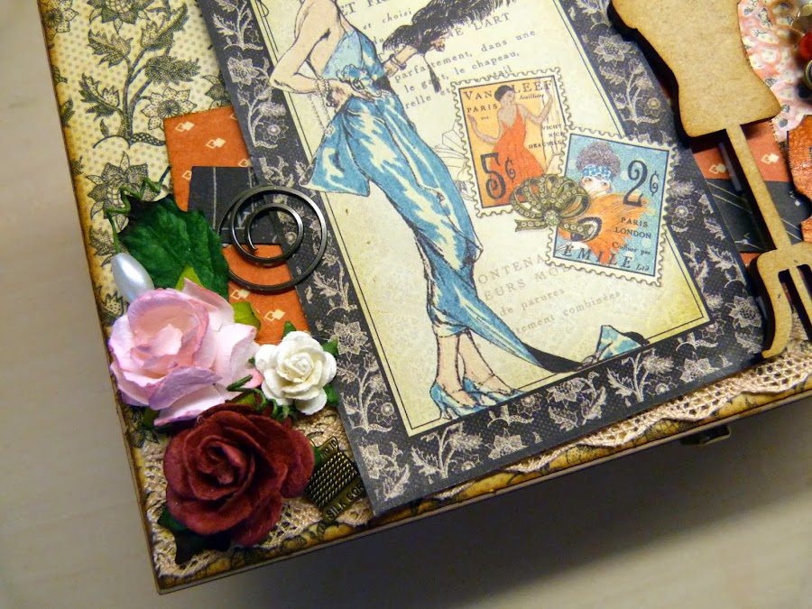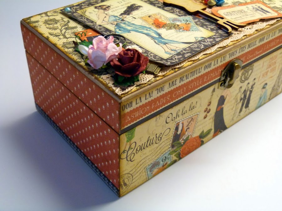 Y para completar la parte superior de la caja un troquelado de madera, un par de alfileres y una blonda pastelera entintada con Distress Tea Dya y Fired Brick.