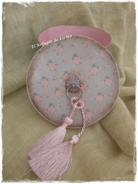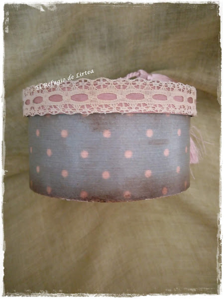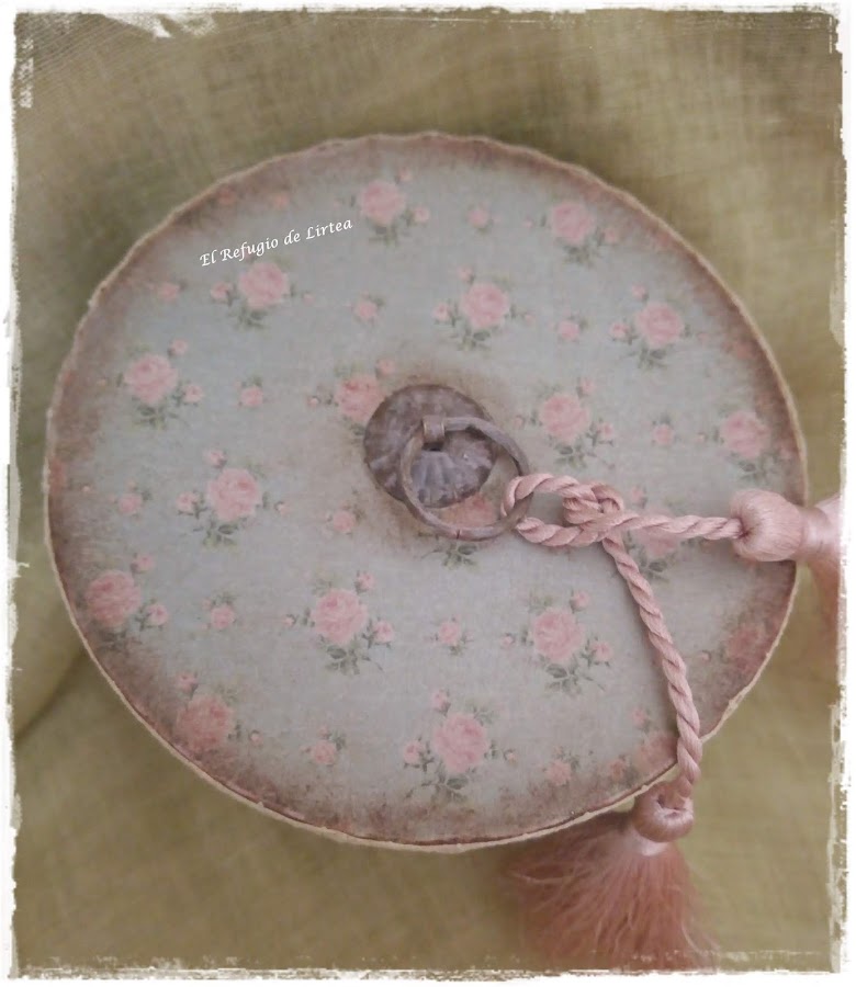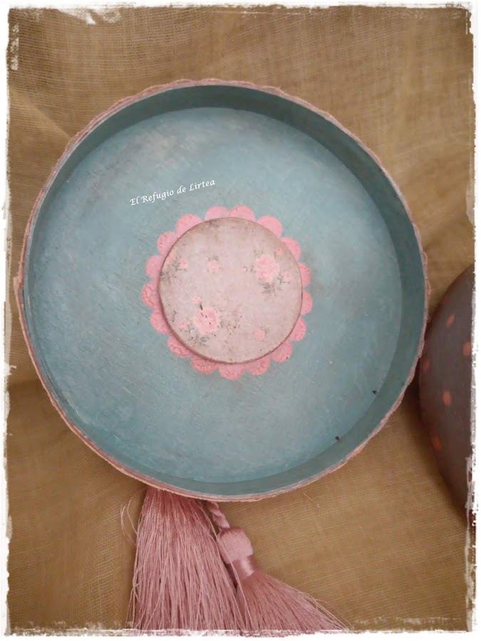 He pintado con una aguada de acrílica en color rosa una puntilla que pegué sobre el lateral de la tapa , lateral que deje pintado en rosa y le coloque un adorno en el centro del que prenden unos borlas.
