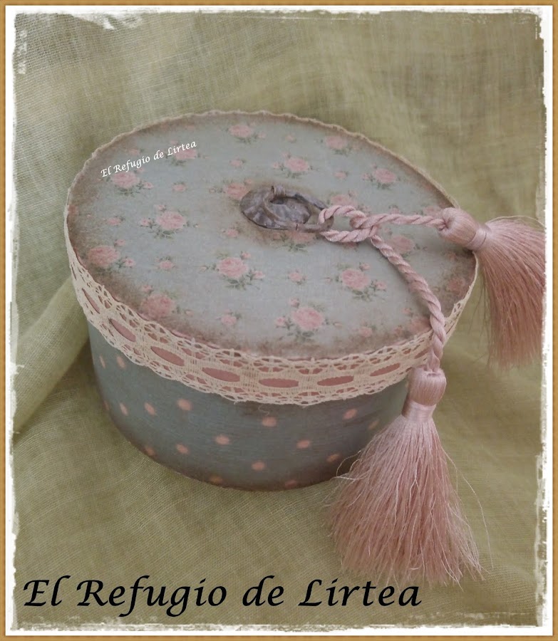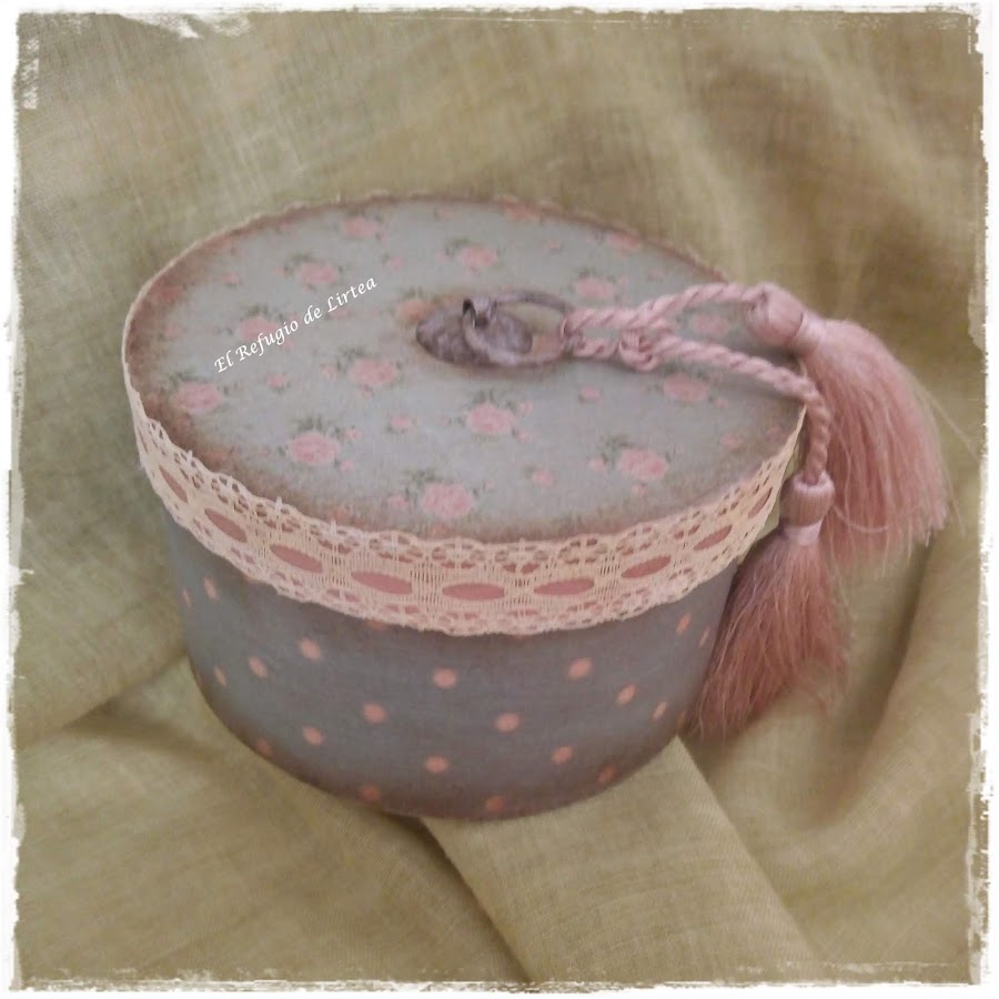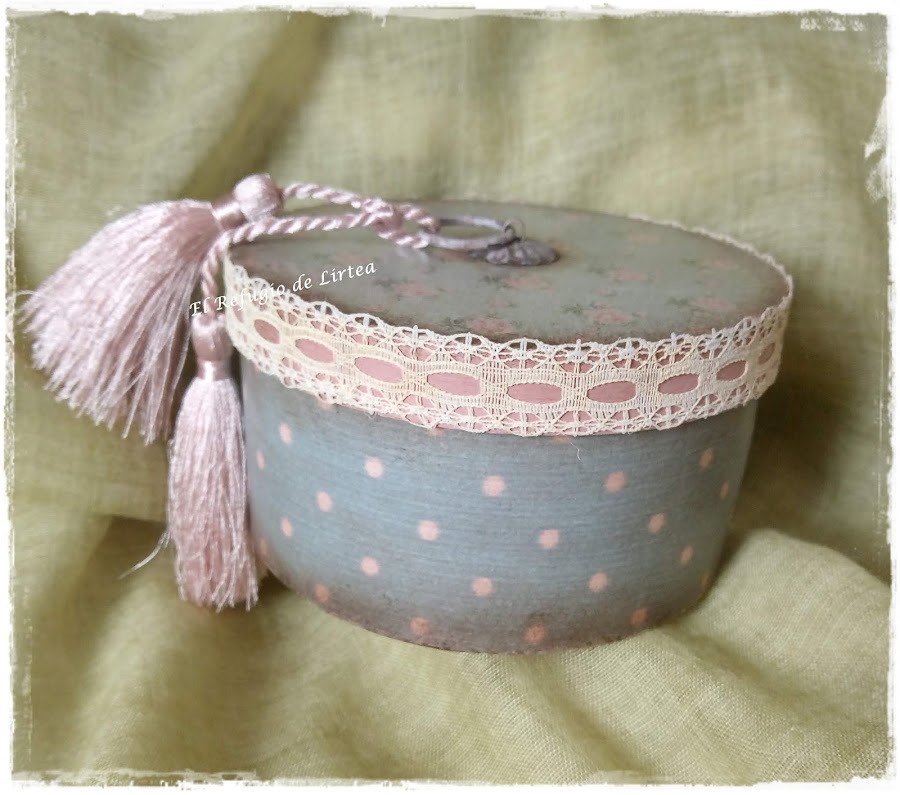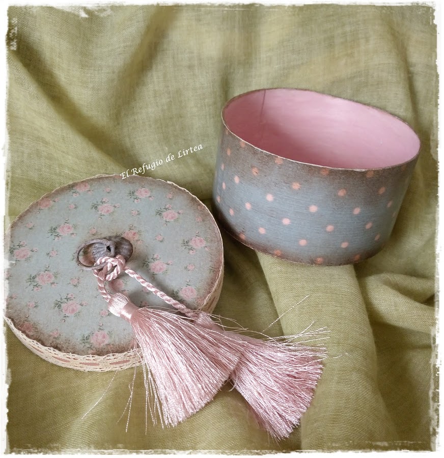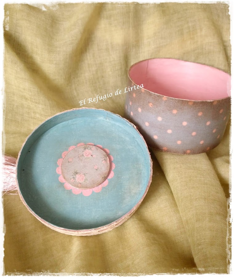Esta que he hecho está toda empapelada. Lleva un papel de topitos en la base y en la tapa un papel de flores, por dentro la pinté con acrílicas.