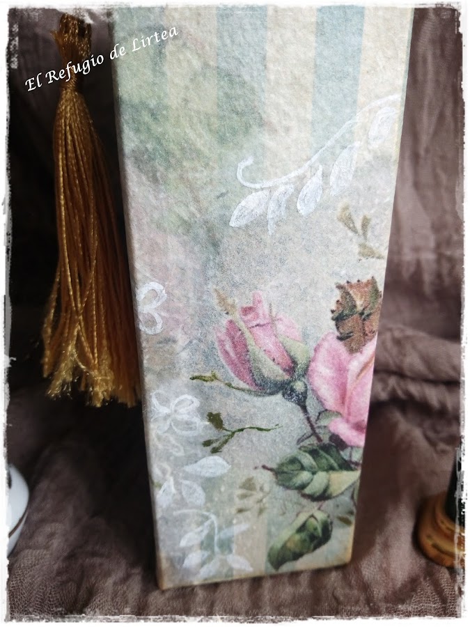 En las parte de la caja que no pude cubrir con el papel las fui integrando con pinturas acrílicas, realicé un estencil en blanco y pinte algunas hojas sobre el mismo papel para conseguir una mejor integración.