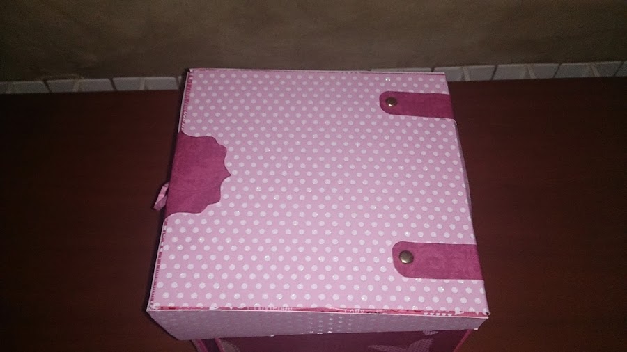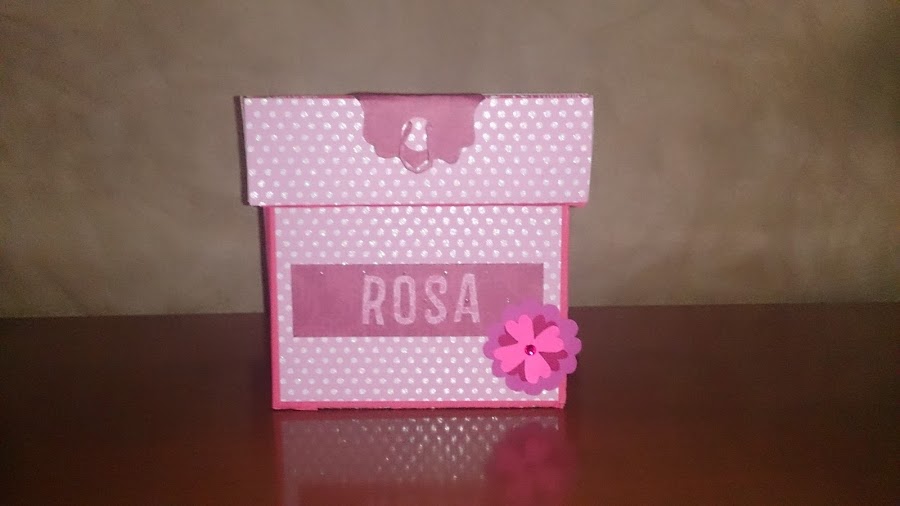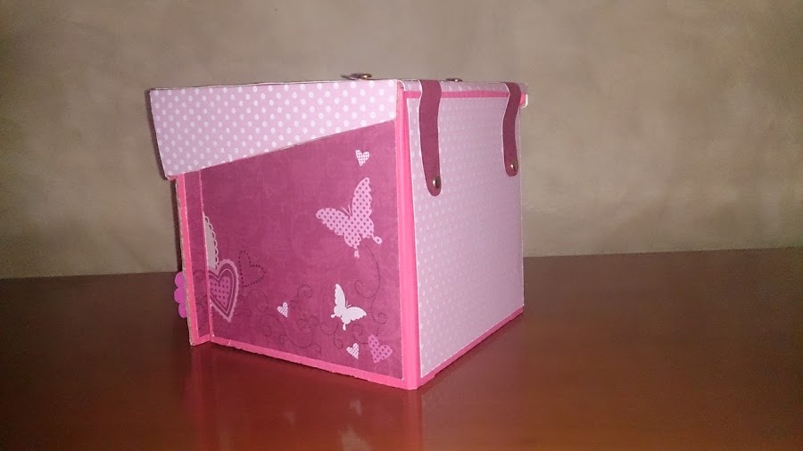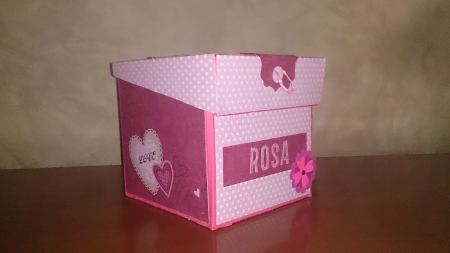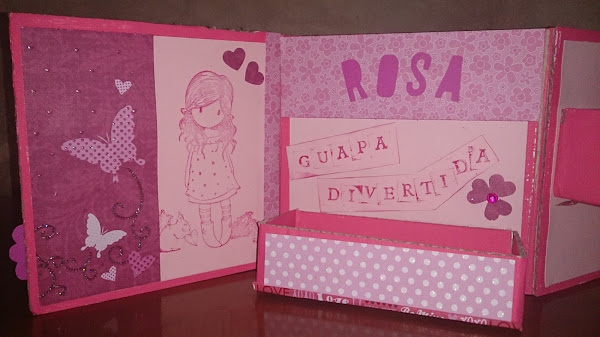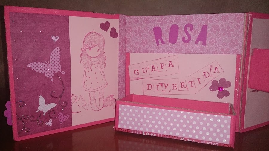 Elaborada con cartón de un cierto grosor y robustez, pintada de color rosa, forrada con papeles scrap y decorada con la muñequita Gorjous, le encantó.